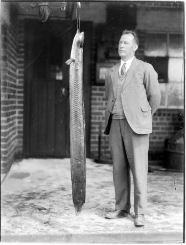 H Orr with large eel, caught Hot Screen Pits in 1920s