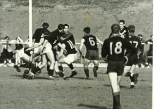 YFC at an Away game (we have white shorts) - probably back to us is Jock McGregor, No 11 maybe Ray Rumbold and face on is Tony Radford