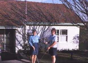 Lila Sneddon & Joyce Connelly showing off their golf trophy in front of house at 23 Driffield Rd