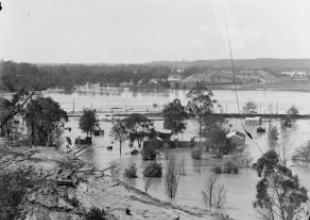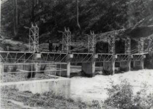 A family walking across the Yallourn Power Station Weir over the Latrobe River. This was destroyed in the floods of December 1934.