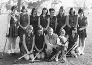 Yallourn Hockey Team at Country Week, Royal Park, Melbourne 1964 (including 2 Moe players): Back Row: Ruth Powell (Moe), Jeanette Foggo, Linda Oke (Moe), Marie Larkin, Jan McHenry, Veronica Lacey, Jill Dolphin, Eireen McInnes Front Row: Sherrie McKean, Bev Walton, Win Lacey, Pam Houston, Deanna Pinal (Not in photo - Coach: Ted Polkinghorne)