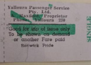 A bus ticket from Yallourn Passenger Service PTY LTD, Prop. A.Maxwell. Date unknown but dad said that Mr Maxwell started the very first passenger service for Yallourn residents and was eventually taken over by Latrobe Valley Bus Service? I don't know what the "Renwick Pride" refers to at the bottom of the ticket?? I'm guessing that the 1920's truck/bus pictured at the Yallourn Railway Station in one of the pix may have been Mr Mawell's? I wonder if people can access or do a search of old companies that were PTY LTD? Kindly sent in by Wayne Tangey (YTS 1966)