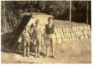 Beanland brothers - David, John & Graham - in front of air-raid shelter at 26 Hillside in 1947.
