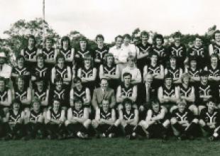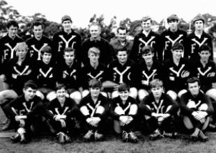 Back Row: Jeff Browitt, Ian Burrows, Paul Wiggins, Bill Godfrey (Coach), ? , ? , Ian Pringle, John McClare Middle Row: John Crane, Russell Hawken, Dallas King, Geoff Foggo, Graham French, David Magnusson, ? , Brent McArthur Front Row: John Canovan, Ronnie Goss, Barry Lyon, Graeme Melbourne, Gary Hedt, ?