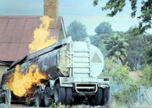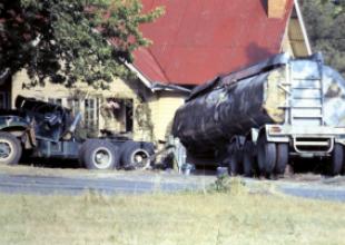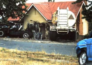 The last 3 houses standing in Yallourn at the end of 1981 were demolished by using them as a training unit for the National Safety Council of Australia. Could the house with the red roof be 23 Latrobe Avenue? Does anyone recognise the house or the palm tree in the background?
