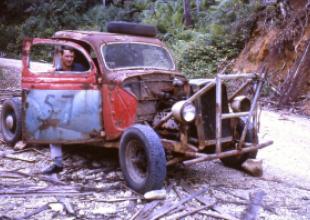 David Apps - approx 1960 - on the slopes of Mt Erica sitting in an ex-stock car with a 38 Ford V8 motor cobbled to a truck gearbox. It was used for a bit of sport on the forest tracks in the area. This was probably the last time it was driven as the engine had seized coming back down the track, the car had spun three times when the back wheels locked and that is a look of relief on the driver's face since, most surprisingly, the car stayed on the road.
