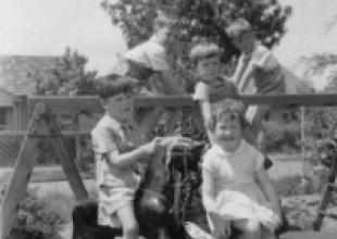 1955 at kindergarten. Lachlan is draped over the wooden beam with Bev Malpass in front of Lachlan and Graeme Sneddon at the back right. The boy on the horse lived in Erica Street I think and maybe did not survive a much later asthma attack? ... Lachlan