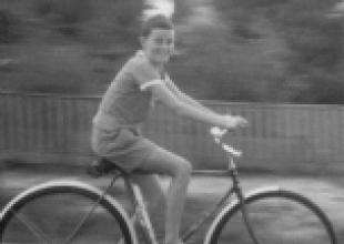Ewen McPherson riding Lachlan's brand new bike down Allambee Crescent taken by Lachlan with his brand new Kodak Starlet camera around Xmas in about 1961 or 1962.