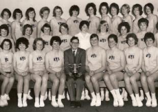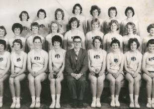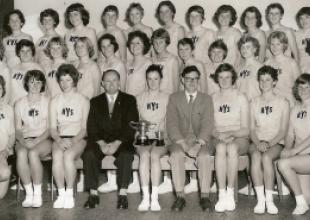 Yallourn 1st Victorian Championships held at Royal Park, Melbourne - Coaches Keith Hollingsworth and Don Dyall Back Row: Ann Vincent, Myra Haddrick, Jean Humphries, Vera Kolymyec, Sandra Prust?, Elin Taig, Winifred Lacey, Val Humphries, Sue Henschell?, Leanne Cooper?, Liz Lewis Middle Row: Robyn Mooney, Margaret Lewis, Sandra Thompson, Iris Ortolja, Wendy Black, June Morgan, Joan Vickery, Malek xxx, Dianne Wilson, Carole Hunt, Lorraine Dupree, Lyn Schroeder?