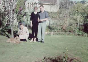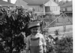 Wearing dad's (Chris) navy cap. (Perhaps it was Neville's cap as he was in the navy around that time too?)